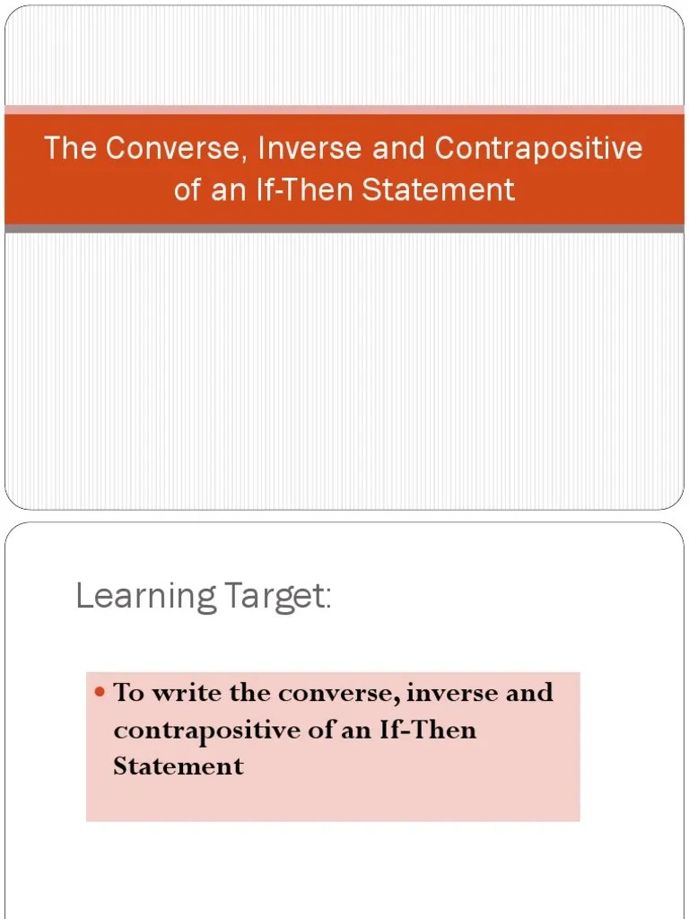 ➢ write a conditional statement on the board and under it, write the converse, inverse, and contrapositive statement. This will include a) identifying the converse, inverse, and contrapositive of a conditional statement . Determine the converse, inverse, contrapositive, and biconditional of the following statement. What we want to achieve in this lesson is to be familiar with the fundamental rules on how . The contrapositive is logically equivalent to the original statement.